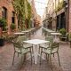 Introducing the 4 Seater Sky 80x80 Table in White with Paris Chairs in Green, a stylish and functional dining set perfect for both indoor and outdoor use. This set features the durable Sky Table in White, crafted from weather-resistant resin with a metallic frame that ensures unrivaled durability and longevity. The table is UV protected, guaranteeing that its white color will remain vibrant and fade-resistant over time. With its stacking and knock-down design, it offers convenient storage and transportation options.
