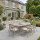 The Hampshire chairs complement the table beautifully with their square back design and sloping armrests, providing both style and comfort. Each chair is accompanied by plump cushions in a muted beige color, blending harmoniously with the sahara color scheme. The cushions are easily cleaned and come with zip-up covers. It is recommended to take the cushions indoors every evening to protect them from the elements. The chairs are stackable, offering versatility and convenient storage, and require minimal maintenance with just a quick wipe down.