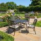 The solid, well-placed round table, measuring 74cm in height and 110cm in diameter, is ideal for outdoor dining. It features a hole in the centre to accommodate a parasol, enhancing the functionality of the set.